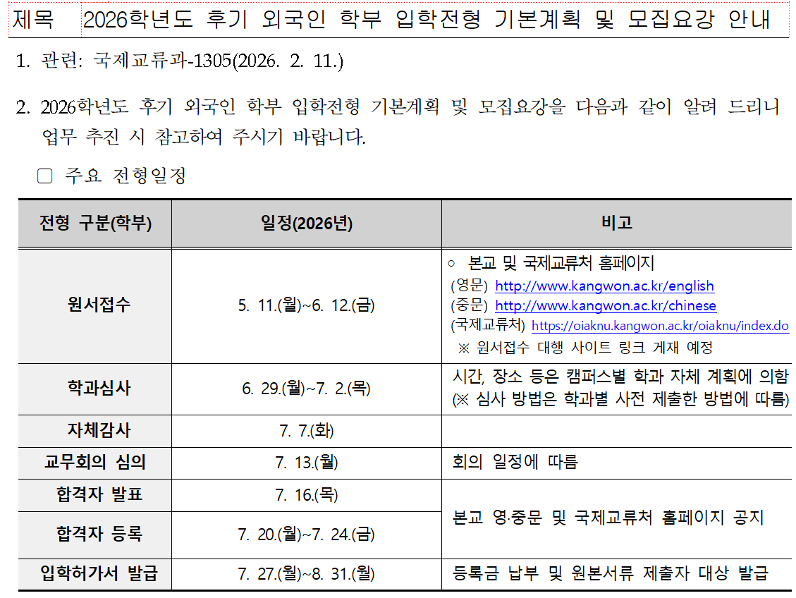 2026학년도 후기 외국인 학부 입학전형 기본계획 및 모집요강 안내