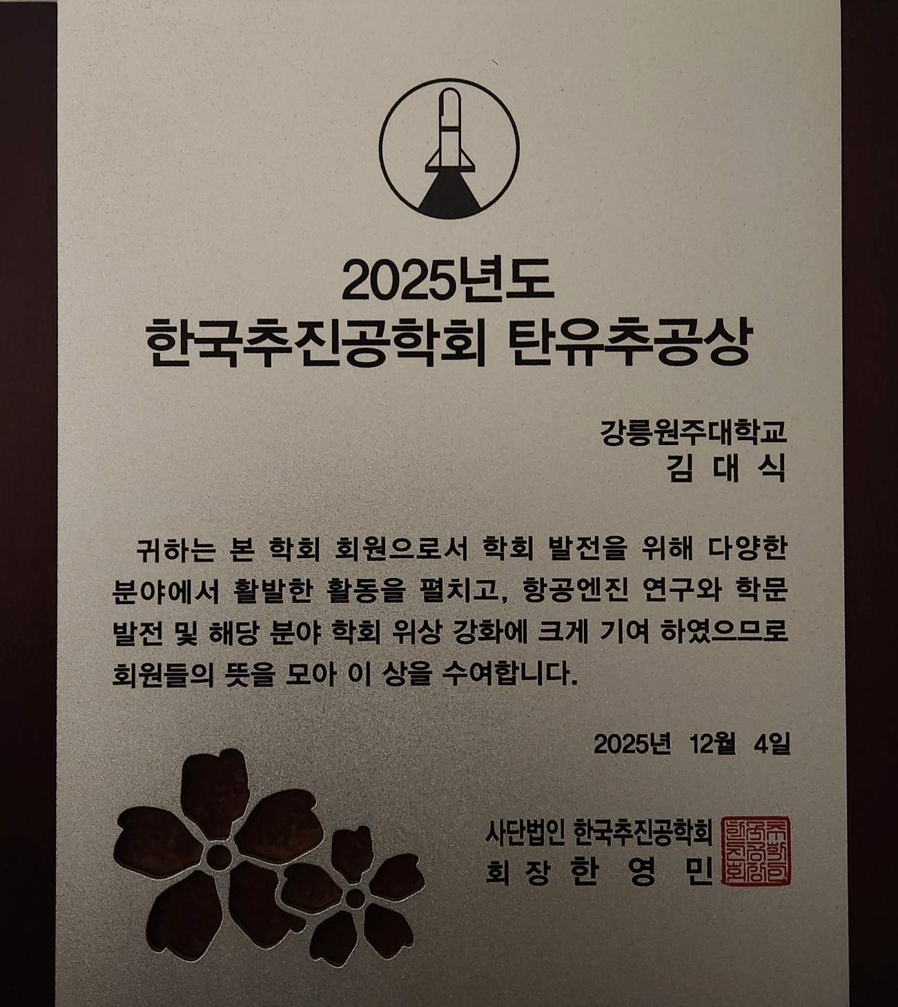 2025년 한국추진공학회 추계학술대회에서 ‘탄유추공상’을 수상했다.