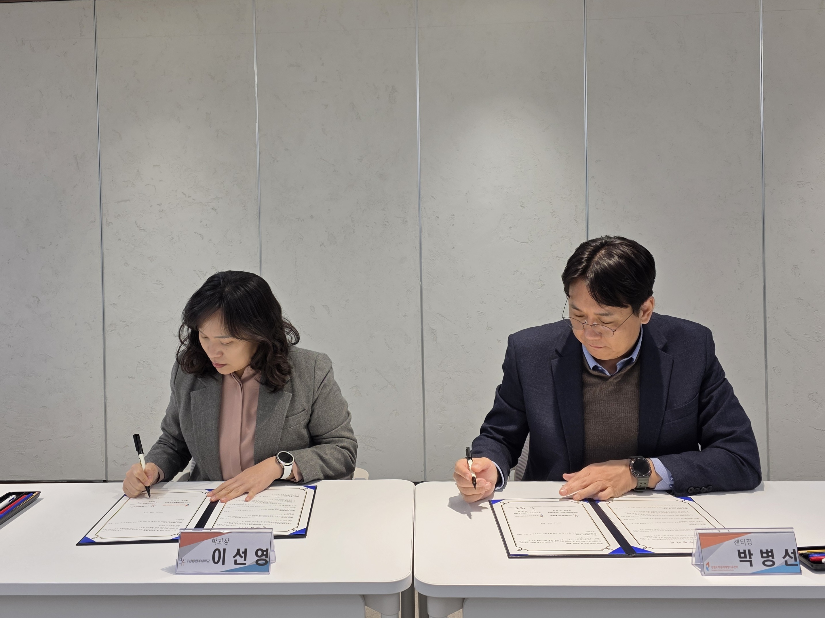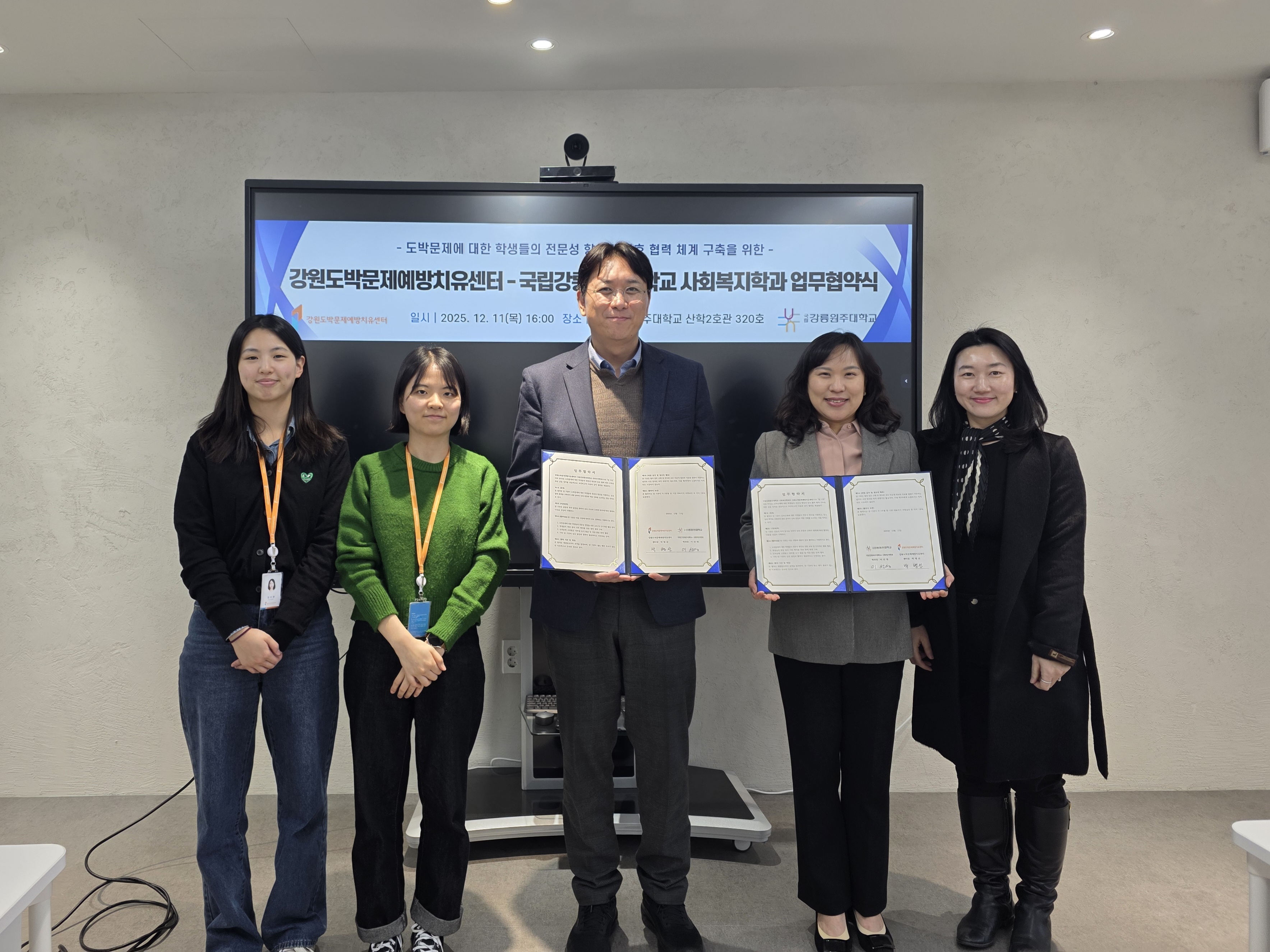 사회복지학과(학과장 이선영)와 강원도박문제예방치유센터(센터장 박병선)는 도박문제에 대한 학생들의 전문성 향상과 상호 협력 체계 구축을 위한 공동 목적을 효율적으로 추진하고자 1211() 오후 4, 원주캠퍼스 현장체험오픈센터(W4) 302호에서 업무 협약을 체결했다.