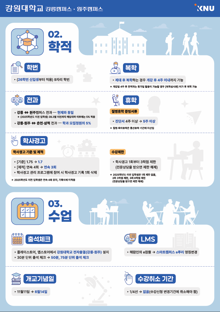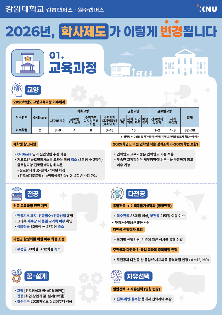 fnctId=bbs,fnctNo=880 통합 강원대학교 교육과정 및 학사제도 안내 인포그래픽 배포 작성일 2026.02.27 작성자 홍승연 조회수 387 첨부파일 첨부파일이(가) 없습니다.