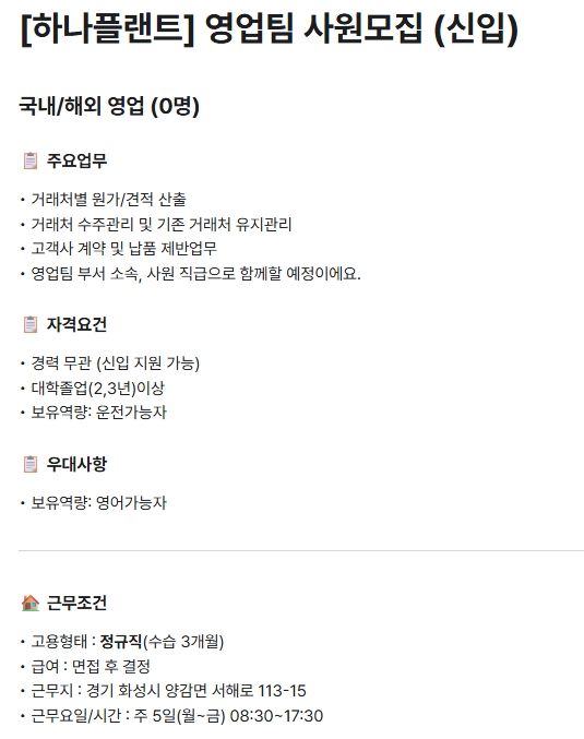 fnctId=bbs,fnctNo=1253 [하나플랜트] 영업팀 사원 모집(신입) 작성일 2025.10.28 작성자 최지은 조회수 747 **학과 졸업생이 많은 기업입니다. 관심 있는 학생은 연락주세요! 첨부파일 첨부파일이(가) 없습니다.