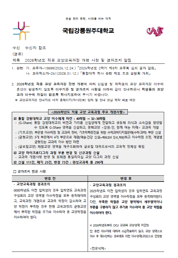 [중요]2026학년도 적용 교양교육과정 개편 사항 및 경과조치 알림