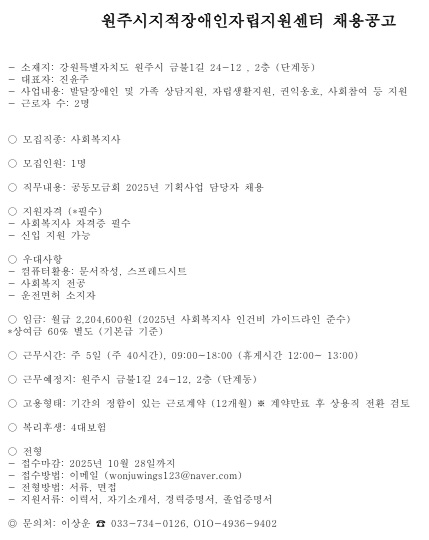fnctId=bbs,fnctNo=850 원주시지적장애인자립지원센터 채용공고(~10.28.까지) 작성일 2025.10.20 작성자 박아름 조회수 800 첨부파일 첨부파일이(가) 없습니다.